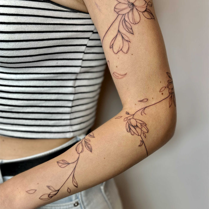 Specjalizuje się w cienkich liniach, motywach kwiatowych, delikatnych napisach i mikrorealizmie. Serdecznie zapraszam na sesję. U mnie nie będzie bolało!